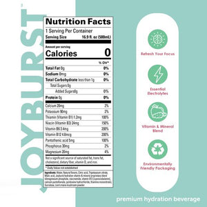 Ingredients: Water, Natural flavor, Citric acid, Malic acid, Tripotassium citrate, Joyburst hydration vitamin & electrolytes blend (dimagnesium phosphate, niacinamide, vitamin B12 [cyanocobalamin], calcium pantothenate, pyridoxine hydrochloride, thiamine mononitrate), Sucralose, Lion’s mane mushroom powder.